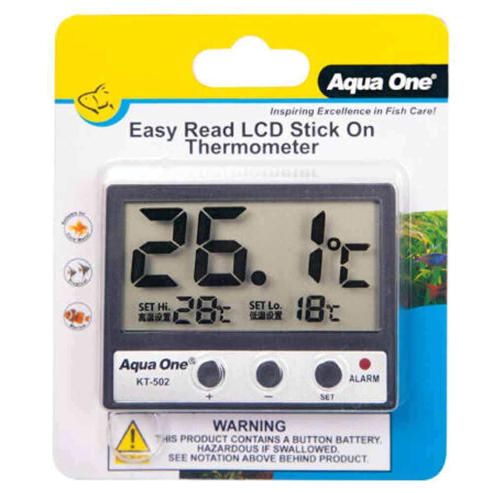 Aqua One Easy Read LCD Stick On ThermometerThe Aqua One Easy Read LCD Stick on the Thermometer easily attaches to the outside of the glass aquarium without wires or probes. The large digital display provides accurate temperature monitoring from the exterior of a glass aquarium with ease.The aquarium thermometer measures temperatures from 0 to 37 degrees Celsius. It also features an adjustable temperature alarm that beeps and flashes when the aquarium exceeds the set parameters.Large, easy-to-read LCD displayDouble-sided tape securely mounts thermometer on the exterior of a glass aquariumProvides accurate temperature monitoring from the exterior of a glass fish tankTemperature range: 0°C – +37°CAdjustable temperature alarmAlarm indicator briefly sounds and continuously flashes when the aquarium reaches a range outside the set parametersSetting the temperature alarm thresholdsTo set the temperature alarm, hold the SET button for 2 seconds.When SET Hi. appears, use the +/- buttons to set the high range, then press SET.When SET Lo. appears, use the +/- buttons to set the high range, then press SET to confirm.The alarm will sound, and the LED will flash when the High or Low temperature is exceeded. Pressing any button will silence the alarm. If the temperature is still outside the set range, the alarm will sound again in 1 hour.