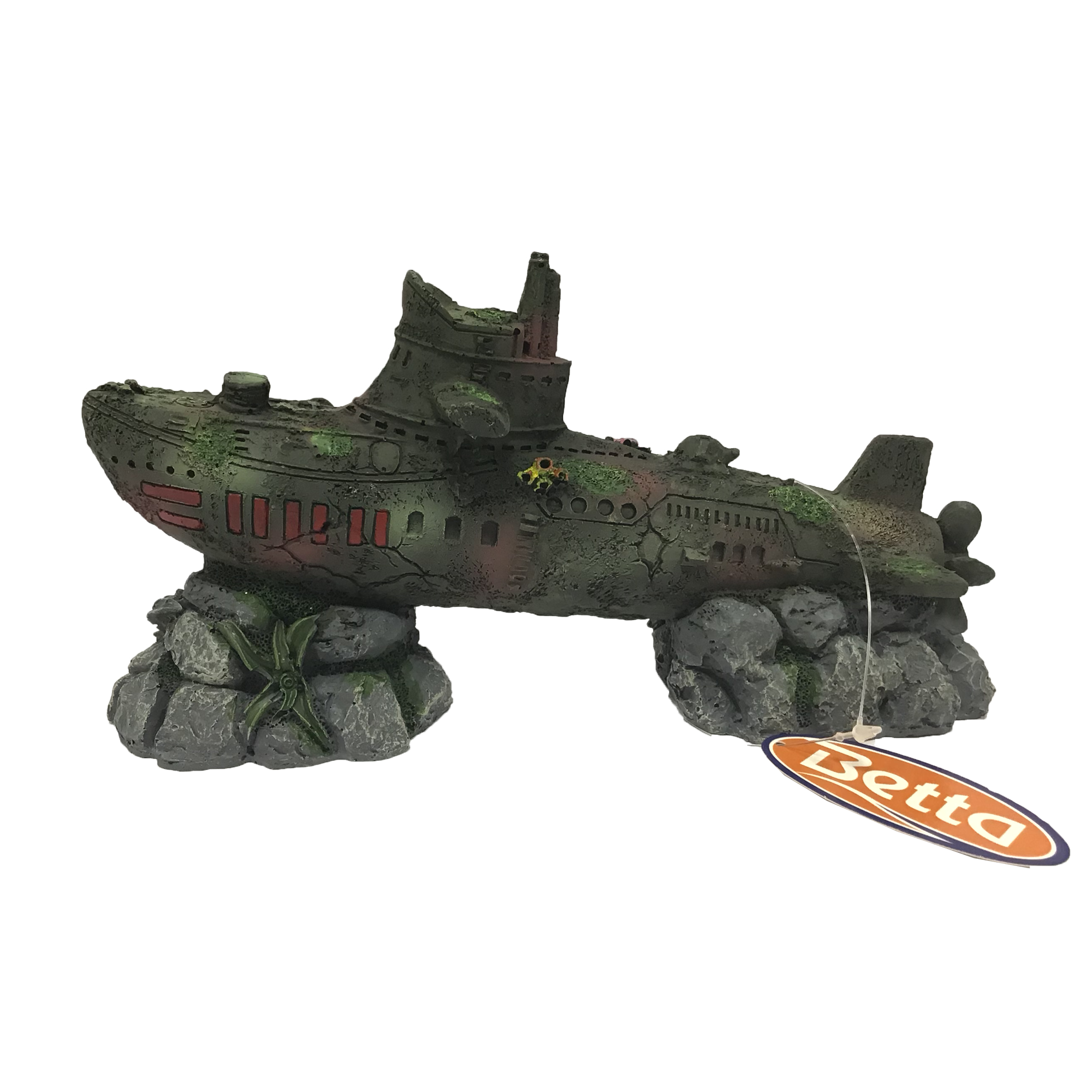 Betta Submarine depicts the wreckage of a wartime vessel. It will look especially good in a small aquarium, placed on some rocks. Approximate dimensions: 26cm (w) x 13cm (h) x 9cm (d).